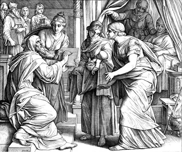 Елисавете же настало время родить, и она родила сына. И услышали соседи и родственники её, что возвеличил Господь милость Свою над нею, и радовались с нею. В восьмой день пришли обрезать младенца и хотели назвать его, по имени отца его, Захариею. На это мать его сказала: нет, а назвать его Иоанном. И сказали ей: никого нет в родстве твоём, кто назывался бы сим именем. И спрашивали знаками у отца его, как бы он хотел назвать его. Он потребовал дощечку и написал: Иоанн имя ему. И все удивились. И тотчас разрешились уста его и язык его, и он стал говорить, благословляя Бога. И был страх на всех живущих вокруг них; и рассказывали обо всём этом по всей нагорной стране Иудейской. Все слышавшие положили это на сердце своём и говорили: что будет младенец сей? И рука Господня была с ним.