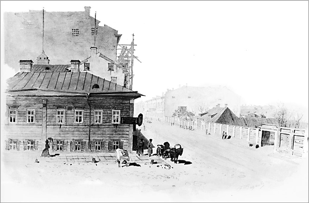Деревянные дома на Бассейной улице (современная ул. Некрасова). Акварель Ф.Ф. Баганца. 1860-е гг.