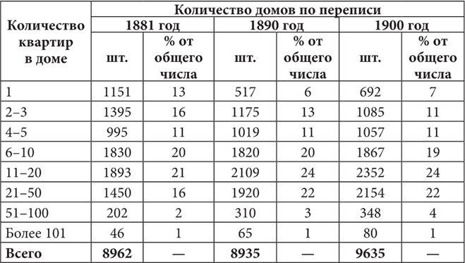 Динамика изменений размеров петербургских домов в последнюю четверть XIX века хорошо прослеживается по данным городских переписей, проводившихся в 1881, 1890 и в 1900 годах. Из таблицы 1, составленной по данным этих переписей, видно, как резко уменьшается доля маленьких (1–3-квартирных) домишек, как устойчиво держится доля средних по количеству квартир домов. Удивляет единичность крупных (более 50 квартир) домов.