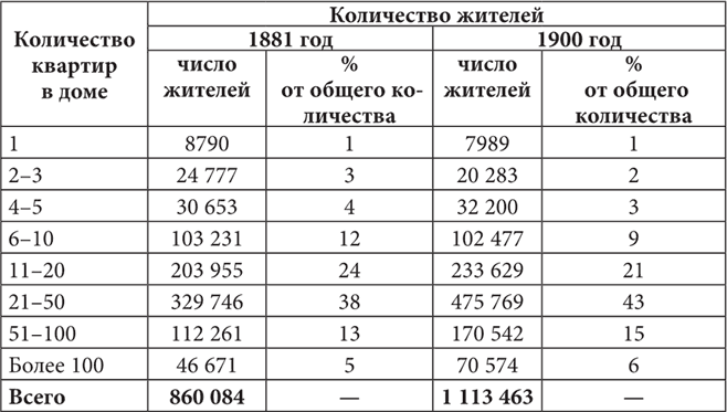 Подавляющее большинство петербуржцев (85 %) к концу XIX века жило в многоэтажных, многоквартирных (более 10 квартир) домах. Причем доля живущих в многоквартирных домах выросла на 5 %. Как видим, основная масса петербуржцев жила в домах, где было от 20 до 50 квартир (табл. 2).