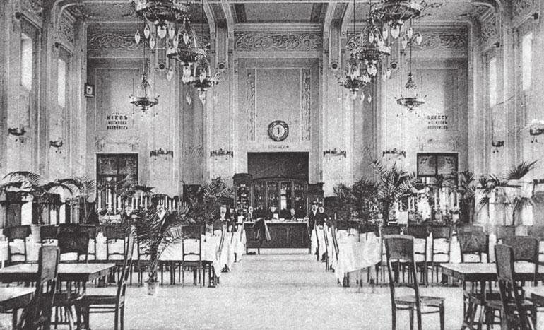 В свое время очень популярна была кухмистерская Мильбрета, располагавшаяся в Кирпичном переулке. Это заведение проработало более шестидесяти лет и с годами стало своеобразным эталоном в качестве обслуживания. Обед здесь стоил 50 копеек и состоял из следующих четырех блюд: бульон с клецками или борщ на первое, телятина с рисом, сосиски с капустой или судак по-польски на второе, ростбиф или шнелькопс (блюдо из фарша, муки и картофеля) на третье и, наконец, кофе, мороженое или яблочное пирожное на десерт. У кухмистерской был свой винный погреб с большим ассортиментом вин со всего света. Желающим почитать прессу официанты предлагали до двадцати различных периодических русских и зарубежных изданий.