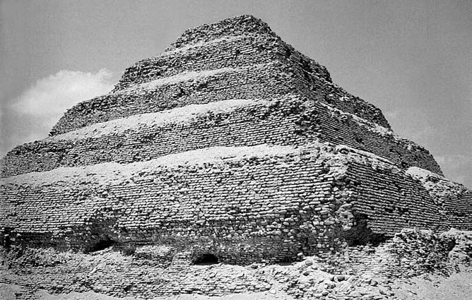 Так склалося, що найвідомішими пам’ятниками давньої єгипетської архітектури стали гробниці, особливо Великі піраміди, що їх давні греки вважали першим з семи див світу. Але протягом своєї багатовікової історії єгиптяни будували піраміди відносно недовго. Поховання перших єгипетських царів, фараонів мають досить скромний вигляд. Камеру, куди клали мумію в саркофазі, викопували в грунті. Зверху робили насип, який обкладали кам’яними плитами. Утворена споруда мала плаский верх і скошені стіни. Таке поховання археологи називають арабським словом мастаба. Пізніше, коли гробниці фараонів стали більш вражаючими, у мастабах продовжували ховати знатних єгиптян. Першу справжню піраміду збудував на початку III тисячоліття до н. е. архітектор Імхотеп, могутній міністр засновника Третьої династії фараона Джосера. Ця піраміда не мала гладеньких стін, а була уступчастою. Вона являла собою нібито п’ять мастабів різного розміру, поставлених одна на одну. Піраміда Джосера мала висоту 30 м, і, мабуть, її вважали б дуже величною спорудою, коли б її славу не затьмарили наступні.