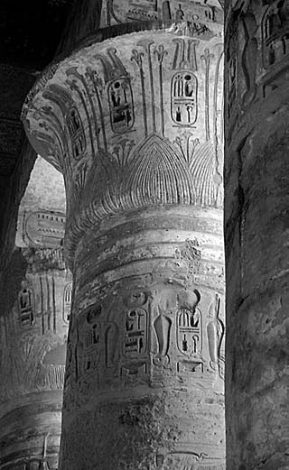 Важливою деталлю єгипетських архітектурних пам’яток є численні кам’яні колони, виконані у вигляді лотосів, пальм або пучків очерету. У напівтемряві храмових приміщень вони справляють дивне враження: здаються м’якими та гнучкими. Простягаєш руку – і з подивом відчуваєш під долонею жорсткий холодний камінь.