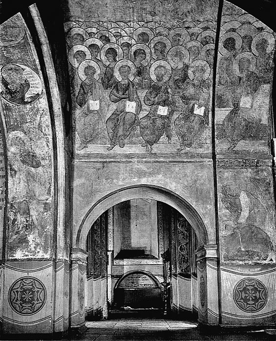 Князья попадали в собор по специальным переходам прямо из княжеских палат, а священники – из епископского дома. Раскопки, произведенные в начале XX в., показали, что вблизи храма действительно находилось какое-то здание, соединенное узким проходом с собором. В летописях также указывается на существование таких переходов.