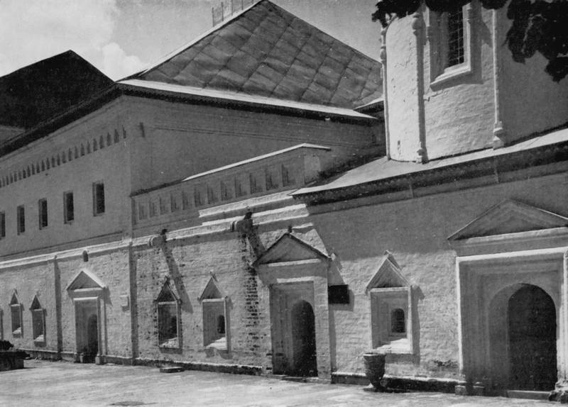 На месте деревянного дворца Ивана Грозного возвели новые «царские хоромы» – длинное деревянное строение из шести секций. У каждой секции был отдельный лестничный ход. Напротив Троицкого собора стояли деревянные палаты царицы и царевича, а к западу от них – двухэтажные кельи архимандрита.