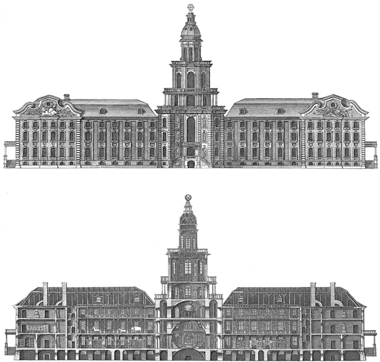 Фасад и разрез здания Кунсткамеры. Гравюра, 1741. © Музей антропологии и этнографии им. Петра Великого (Кунсткамера). MЛ–890 и MЛ–891