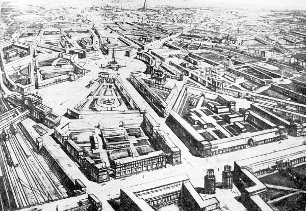 Эскизный проект планировки района 1-й Мещанской улицы. 4-я архитектурно-планировочная мастерская (руководитель Г. Б. Бархин). 1934 г. Проект предусматривает практически полное уничтожение всей застройки, включая капитальные сооружения – дома дешевых квартир имени Солодовникова, Рижский вокзал и другие, сохраняя лишь Крестовские водонапорные башни (на рисунке – справа внизу)