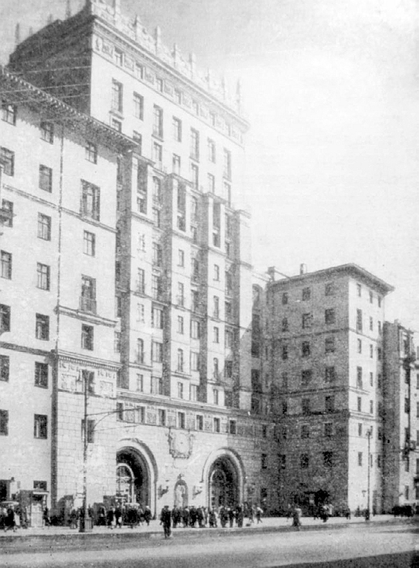 Участок под нынешним № 49 сначала отводился под строительство обычного семиэтажного жилого дома Министерства заготовок по проекту З. М. Розенфельда и В. М. Галкина[51], однако вскоре планы изменились самым коренным образом. В 1949–1950 годах на этом месте выросла четырнадцатиэтажная жилая «башня» Министерства угольной промышленности СССР (архитекторы К. М. Метельский, Б. С. Виленкин, Б. С. Бабьев, инженер И. В. Казаков), вертикальной устремленностью и отделкой фасада напоминающая высотное здание на Смоленской площади, однако лишенное венчания. Такое решение отнюдь не диктовалось градостроительной ситуацией – участок располагался на углу с ничем не примечательным Капельским переулком, выделять который мощным архитектурным акцентом вовсе не требовалось.