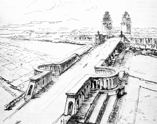 Первый проект архитектурного решения выполнил в 1935 году архитектор М. С. Жиров. Основное внимание он сосредоточил на соединяющей два путепровода насыпи, предложив сделать ее «местом отдыха» (!) и в соответствии с этим поставив по ее сторонам длинные и высокие колоннады[57]. По мысли автора, такое решение придало всему сооружению необходимую монументальность. Какой отдых можно было организовать близ оживленной магистрали, в дыму, извергаемом пролетавшими в нескольких метрах отсюда паровозами, М. С. Жирова, очевидно, не заботило.