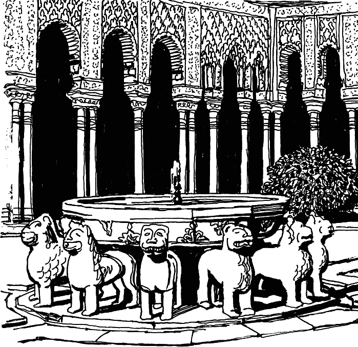 Главным центром Альгамбры, вокруг которого крутилась жизнь резиденции правителей Гранады, был Комарес – хорошо укреплённый дворец с 45-метровой башней, где находился Тронный зал с огромными окнами и стенами, украшенными искусной резьбой. Внутренний двор Комареса – так называемый «Миртовый дворик» – знаменит своим обсаженным миртовыми деревьями бассейном, отражение в котором едва ли не прекрасней окружающих его стен, резных колонн и неба. Рядом с дворцом Комарес уютно устроился «Львиный дворик» с садом, покоями правителя и гаремом. Это название дали дворику 12 каменных львов, которые держат на своих спинах большую мраморную чашу, из которой бьёт фонтан. На мрамор чаши изящной арабской вязью нанесены слова знаменитых поэтов и философские изречения.