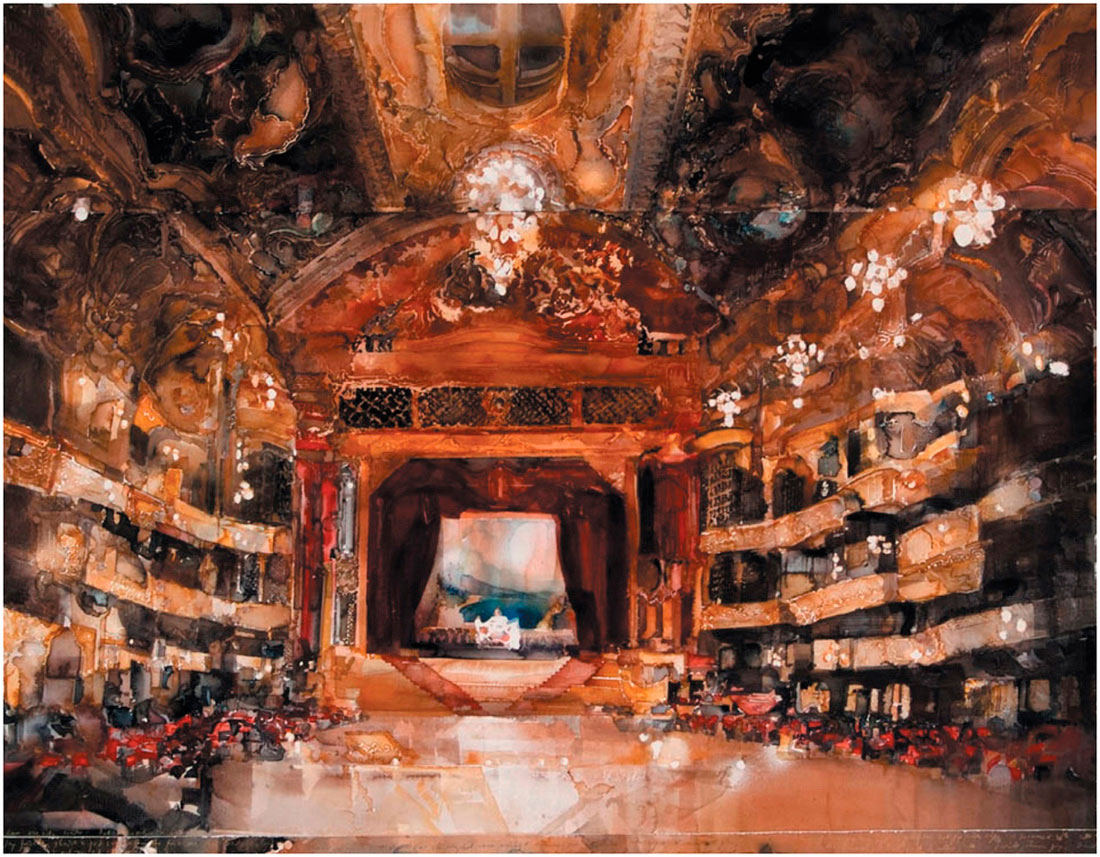 Оперный театр кисти Ларса Лерина выглядит по-настоящему грандиозным. Парадокс заключается в том, что ощущения роскоши и величия Лерин добивается, сознательно ограничивая почти все акварельные переменные: композиция симметрична, в палитре всего три цвета, большинство очертаний – четкие. Однако же в том, что касается тона, художник дает себе волю. Самые темные участки никогда не черные – они остаются полными цвета. Светлых пятен совсем немного, и весь зал кажется раззолоченной пещерой, озаренной одним слабым светильником.