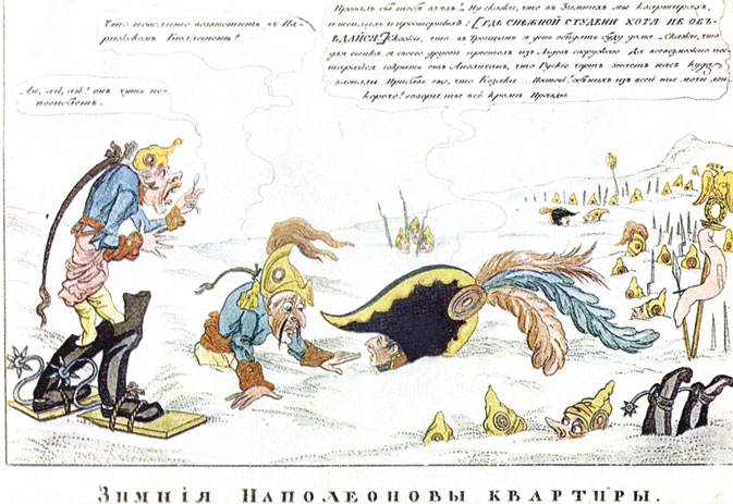 Плохо пришлось французам, не привыкшим к большим морозам, переносить русскую зиму. Их много погибло от мороза. Случалось, что французы замерзали толпами. На обратном пути им приходилось по местам барахтаться по пояс в снегу. Это и представлено на помещенной ниже картинке.