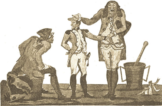 – Язык белехонек (в наказание за то, что много лгал в бюллетенях); пульс едва бьется (от чрезмерного кровопускания); голова в страшном жару (оттого, что не удались сумасбродные планы).