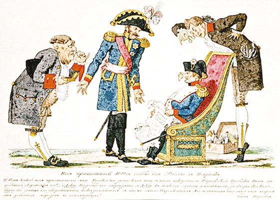 Бертье: Незачем его укорачивать, показывайтесь, Ваше Величество, с ним смело парижанам. Мы напишем, что он у вас вырос в России от ранних морозов и гололедицы.