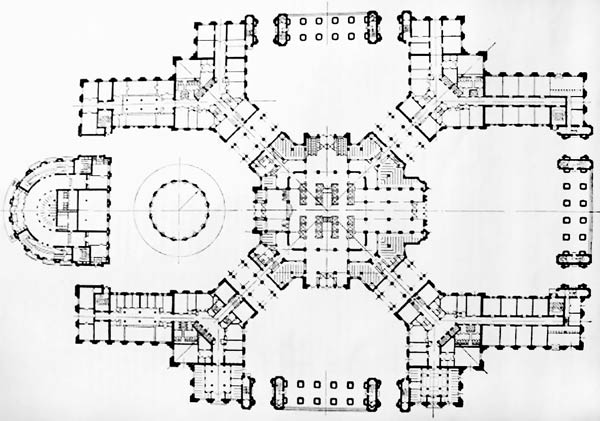 Прием и распределение служащих и посетителей обеспечивали четыре просторных вестибюля первого этажа. Там же располагался и конференц-зал на тысячу мест.