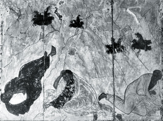 Одной из особенностей работы с линией в благовещенских Праздниках, особенно левой части, является дифференцированный подход к рисунку различных деталей, в первую очередь человеческих фигур, а затем и фона. Как правило, «личное» обрисовывается более тонкими «регулярными» линиями, сравнительно со складками одежд. В свою очередь, эти складки тоньше, чем линии пейзажа и архитектуры. В правой части чина линия рисунка вообще тоньше и ровнее. Она «нейтральна», поэтому мастер практически обходился без дифференцированного подхода. Он проявлял большую сдержанность в рисунке, не уточнял линию, не прорисовывал ее дважды и не стремился к кардинальным исправлениям композиции на стадии внутреннего рисунка, зная по опыту, что нижний графический слой будет перекрыт верхними красочными слоями. Мастер левой половины чина, судя по более энергичному рисунку и более темпераментной линии с нажимом, судя по исправлениям, возможно, был активнее, даже «изобретательнее» на этом этапе работы над образом. Похоже, что он сразу ставил себе «художественные» задачи уже на стадии предварительного наброска. Одни и те же повторяющиеся у обоих иконописцев детали у мастера левой половины чина более четко «отрисованы», в них больше напряжения и творческой воли. Выполненный им предварительный рисунок, оставаясь по-средневековому «служебным», подчиненным, в то же время привлекает своей «изобразительностью». Так, в иконе «Преображение» видно, что в центральной фигуре нижнего регистра юного апостола Иоанна обнаженная по «Преображение», деталь: апостол Иоанн локоть рука, поддерживающая голову, написана линией разной толщины. Кисть руки – совсем тонко, почти «волосяным» штрихом; в абрисе локтя, передающем все напряжение тяжести опирающейся на руку головы, – более толстой линией, все увеличивающейся в месте напряжения мышцы. Рисунку локтя руки апостола Иоанна вторит (в параллельном, явно сопоставимом для глаз ритме) линия склона горки, возвышающейся над фигурой, – она еще толще. Интересно, что созвучный жест и параллелизм линий мы находим и в иконе правой части чина «Положение во гроб» в фигуре Никодима, поднявшего в горестном жесте правую руку. Однако здесь разница толщины линии кисти и локтя, одежды и горки так незначительна, что на глаз с трудом выявляется. Далее, у мастера левой части чина в иконе «Рождество» пологий склон центральной горы над пещерой является «естественным» подъемом для лошадок волхвов, хотя, строго говоря, они находятся в другой пространственной зоне – выше и дальше. Однако между ними сделан переход, художественный по своей выразительности. Под ноги лошадок как бы случайно «брошено» несколько волнообразных мазков, которые сами по себе не изобразительны и несут скорее следы черновой работы, поправок и уточнений. Но эти утолщения линии, адекватные усилению нажима кисти, становятся художественной формой – маленькими холмиками. Сопоставимые с абрисом центрального склона ритмическими соответствиями, они объединяются в единую композиционную канву. Особой артистичностью отличается предварительный рисунок мастера первых семи икон в абрисе горок, архитектурных деталей и ниспадающих складок одежд. Мастер правой части чина проявлял свое мастерство отменного рисовальщика во внешнем белильном рисунке – в краях струящихся драпировок о