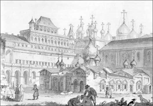 Вид в Кремле на собор Спаса на Бору и Теремной дворец. Конец XVIII века