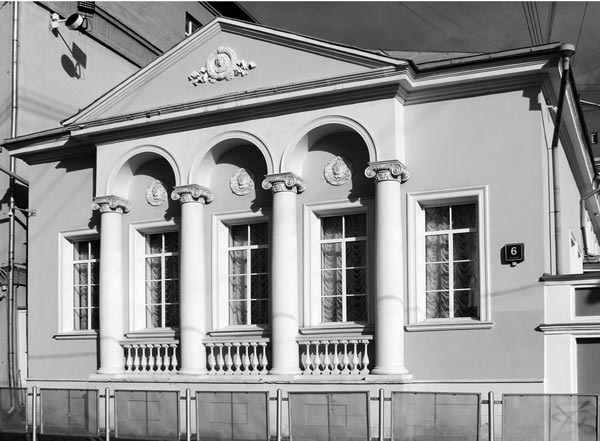 После пожара 1812 года город быстро возрождался, и к 1818 году большая часть жилых домов уже была восстановлена. Дом, принадлежавший мещанке Марии Яковлевой, в Пречистенской части подле церкви Спаса на Песках, также не уцелел в огне 1812-го. Это было одноэтажное деревянное строение на каменном фундаменте, под которым имелся подвал. В 1816 году владение купила поручица А. Г. Щепочкина. Новая владелица начала строить деревянный дом на каменном фундаменте сгоревшей постройки. Сегодня многочисленные экскурсанты могут увидеть фасад небольшого особняка, выходящего пятью окнами в переулок. Его украшает скромный портик из четырех полуколонн ионического ордера, капители объединены тремя простыми арками, внутри которых круглые розетки. Удивляют скромные размеры дома и расположение главного фасада на торце. Эту странность объяснили архитекторы А. Ох и М. В. Фехнер, выполнившие обследование дома. На обнаруженном плане 1821 года существующий дом значится флигелем. На время строительства главного дома Щепочкина, вероятно, поселилась во флигеле, который решила предварительно перестроить. В интерьере появляются зал, разделенный двумя колоннами, кабинет и гостиная. Комнаты прислуги и прачечная отнесены к заднему фасаду. Там же находится лестница, ведущая на антресольный этаж. Перед нами типичная планировка флигеля.