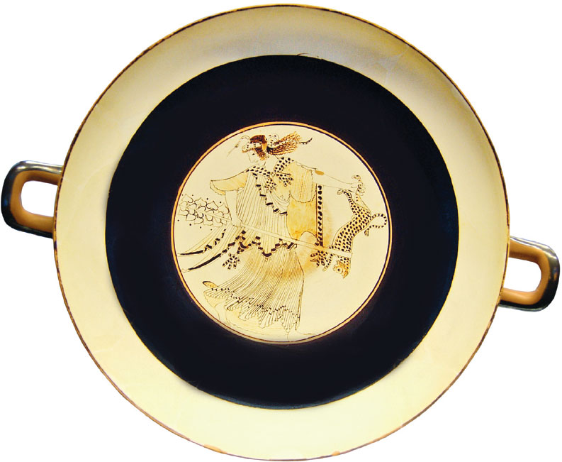 Женщина, нарисованная на дне белофонного килика (древнегреческой чаши для питья), легко опознается как менада, безумная от алкогольного опьянения и божественного присутствия.