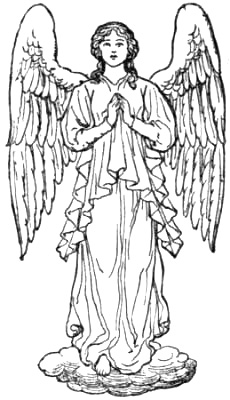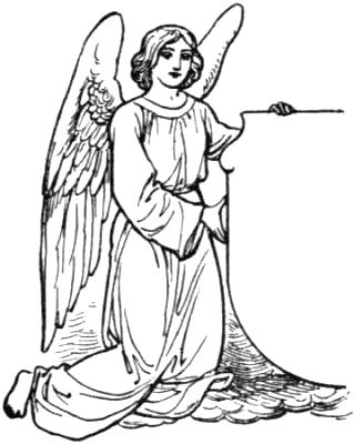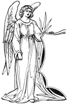 Angel is the name, not of an order of beings, but of an office, and means messenger: wherefore angels are represented young to show their continued strength, and winged to show their unweariedness; without sandals, for they do not belong to the earth; and girt, to show their readiness to go forth and execute the will of God. Their garments are either white, to denote their purity, or golden, to show their sanctity and glory, or they are of any of the symbolical colours used in Christian Art.