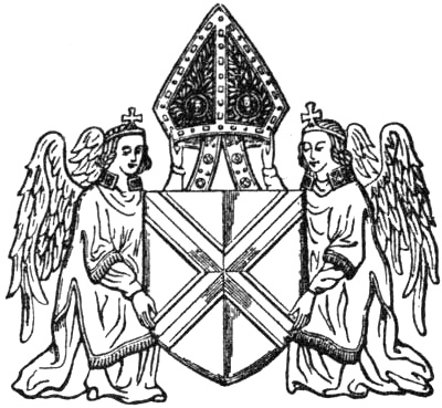 Charles Boutell, M.A., “English Heraldry,” p. 247, says, regarding angels used as supporters to the armorial shield: “The introduction of angelic figures which might have the appearance of acting as ‘guardian angels’ in their care of shields of arms, was in accordance with the feelings of the early days of English heraldry; and, while it took a part in leading the way to the systematic use of regular supporters, it served to show the high esteem and honour in which armorial insignia were held by our ancestors in those ages.” And reference is made to examples sculptured in the noble timber roof of Westminster Hall and elsewhere. As an example we give the shield of arms of the Abbey of St. Albans.