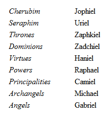 The nine choirs of angels are classed as follow, with the name of the chief of each, according to ancient legend: