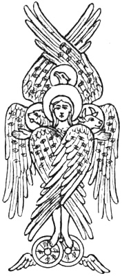 Several forms of these mystical creatures, says Audsley, have been devised by the early medi?val artists; those which display the entire forms of the man, the lion, the ox, and the eagle, all winged and invested with the nimbus, appear to have been most frequently made use of. They are to be met with formed of the heads of the mystical creatures on bodies or half-bodies of winged human figures; at other times we find them comprised in the heads and wings only of the four symbolic creatures. Sometimes they are found united and forming one mysterious being called the Tetramorph with four heads and numerous wings covered with eyes, the feet resting on wheels, which are also winged. The example is taken from a Byzantine mosaic in the convent of Vatopedi, on Mount Athos.
