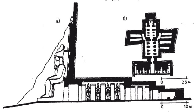 1.8 Скальный храм Рамзеса II в Абу-Симбеле. XIV–XIII вв. до н. э.: а) разрез по оси храма, б) план