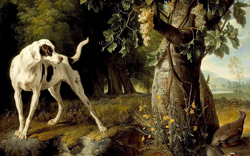 Александр Франсуа Депорт (1661–1743) Пейзаж с собакой и куропатками 1719. Холст, масло. 112x144