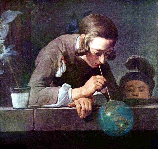 Одним из любимых занятий ребят в XVIII столетии было пускание мыльных пузырей. На данной картине показан юноша, меланхолически выдувающий через соломинку радужный шар. Мальчуган рядом с ним привстал на цыпочки, чтобы разглядеть, как «растет» пузырь. Колорит холста решен в приглушенной охристо-коричневой гамме. Художник прекрасно передал материальность всего изображенного: выщербленный камень, из которого сложен парапет, стакан с мыльной водой, одежду героев и сам переливающийся, тонкий и прозрачный мыльный шар. Этот простой бытовой сюжет скрывает в себе иносказательный смысл, заимствованный из голландской живописи XVII века на тему vanitas. Мыльные пузыри считались символом быстротечности бытия и пустой траты времени. Чтобы подчеркнуть эту идею, мастер сделал главным героем полотна подростка, находящегося на пороге взрослой жизни. Таким образом художник передает основную мысль произведения — не стоит тратить драгоценное время на легкомысленные развлечения.