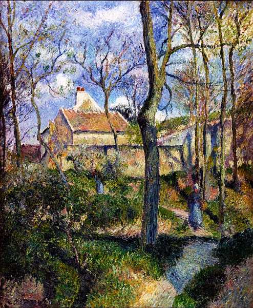 Довольно часто в полотнах Писсарро встречается мотив дороги. Он несет в себе не только смысловую нагрузку, но и помогает гармонично выстроить пространство. В картине «Тропинка к Пуилё, Понтуаз», в которой простой сельский пейзаж получил новое прочтение, художник воссоздал удивительную гармоничную взаимосвязь между природой и крестьянскими постройками. Цветовые пятна, окрашивающие стволы озаренных солнцем деревьев, находят отражение в оттенке крыш зданий. Длинные синие тени, перерезая дорожки и падая на стены каменного забора, зрительно увеличивают количество деревьев. Практически растворяются в пейзаже стройные женские фигуры, идущие по песчаной тропинке. Их голубые фартуки по цвету перекликаются с прозрачной синевой неба.