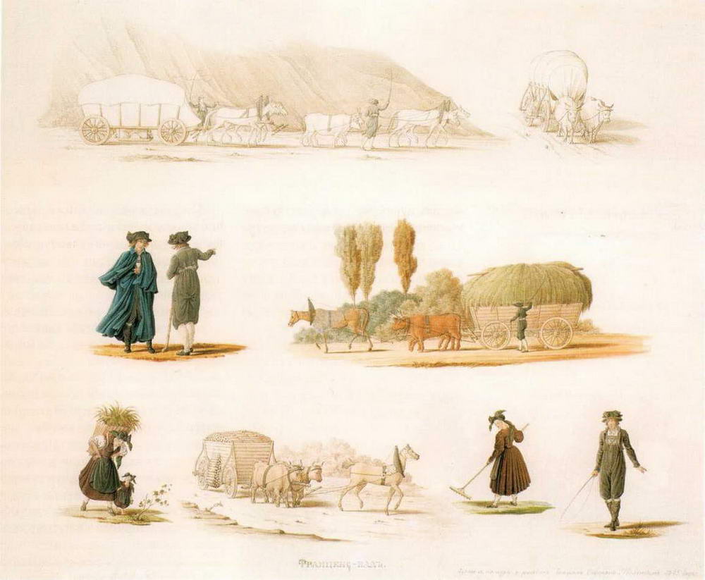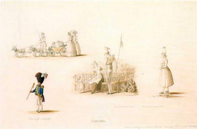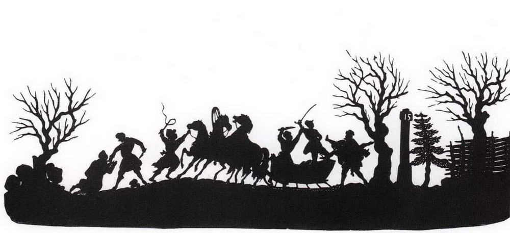 Силуэты сохранили то, что привлекло внимание Толстого на улицах провинциальных русских городов. Выразительные позы, характерные жесты жителей, предметы их одежды - мундир, шинель, платок, фуражка - и перед нами будочник с алебардой в руке указывает дорогу всаднику, фонарщик в накинутой шинели отгоняет преследующую его собаку, две кумушки беседуют, взмах плетки ямщика и переступающая не спеша, а, может быть, осторожно по скользкой дороге лошадь.