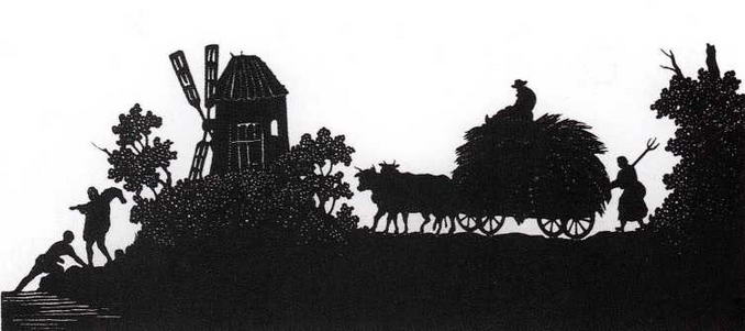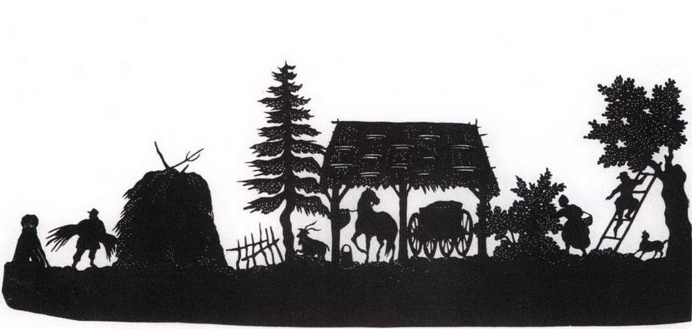 А летом в силуэтах Толстого мужики и бабы деловито убирают сено, пасут коров, собирают яблоки,забираясь по лестницам на высокие яблони. Девушка набирает воду в колодце, рыбаки вытягивают сети. Любители рыбной ловли неподвижно сидят на берегу реки с удочками, а их жены и дети терпеливо наблюдают за ними, стоя поодаль на берегу. Пастух играет на дудочке, парень и девушка весело отплясывают на лугу или в избе на посиделках.