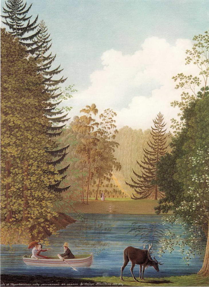 Из Италии Толстой писал Василию Григоровичу, конференц-секретарю Академии художеств: "Я восхищен всем, но все-таки скучно здесь. Я нахожу у нас во многом лучше совсем не по одной только привычке к своему, но тщательно вникая во все (климат и памятники откладывая в сторону, это другое дело), взвешивая везде, где я был, хорошее и дурное с нашим дурным и хорошим, скажу, что по моему уразумению и совести у нас в России в несколько крат лучше... Я не дождусь времени, когда буду иметь радость вернуться в отчизну"[1 Записки графа Ф.П. Толстого, с. 21.].