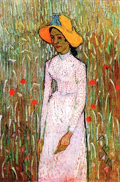 Возможно, в этом холсте живописец решил воплотить образ своей души, выразив в облике крестьянской девушки все свои печали и переживания. Это одна из самых проникновенных и красивых по колориту картин художника. Хрупкое тело девочки, ее длинные худые руки с большими непропорциональными кистями, опущенные плечи, рассеянный взгляд больших глаз — все это передает ощущение тоски. И хотя вокруг героини распростерлась нежная зелень лета, она стоит среди колосьев пшеницы, будто покинутый всеми, одинокий дух полей. Хлеба и цветки маков написаны Ван Гогом абстрактно и в то же время узнаваемо. Известно, что мастер работал над картиной больше обычного, пытаясь изобразить различные зеленые тона злаков, качающихся под порывом ветра.