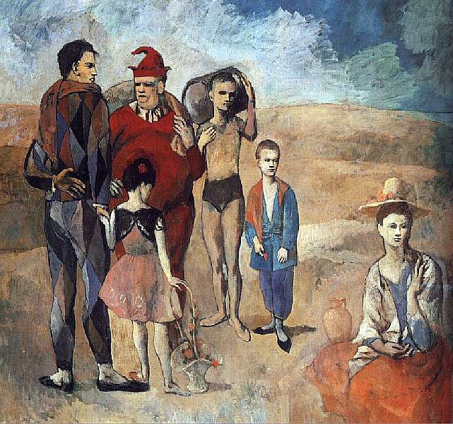 Фигуры комедиантов автор поместил в пустынный, лишенный растительности пейзаж на фоне синего неба, покрытого облаками. Слева — похожий на самого Пикассо Арлекин, который держит за руку девочку, рядом с ними — директор труппы — толстяк, облаченный в красное трико и в колпаке шута, справа — два юных акробата. Вся композиция уравновешивается одинокой фигурой сидящей девушки на первом плане. Персонажи статичны, между ними нет никакой внутренней близости. И хотя они вместе, но каждого сковывает холод внутреннего одиночества. Циркачи застыли, будто в ожидании какой-то команды или приказания двигаться дальше. Большинство произведений Пикассо «розового периода» проникнуто духом трагического одиночества и обездоленности.