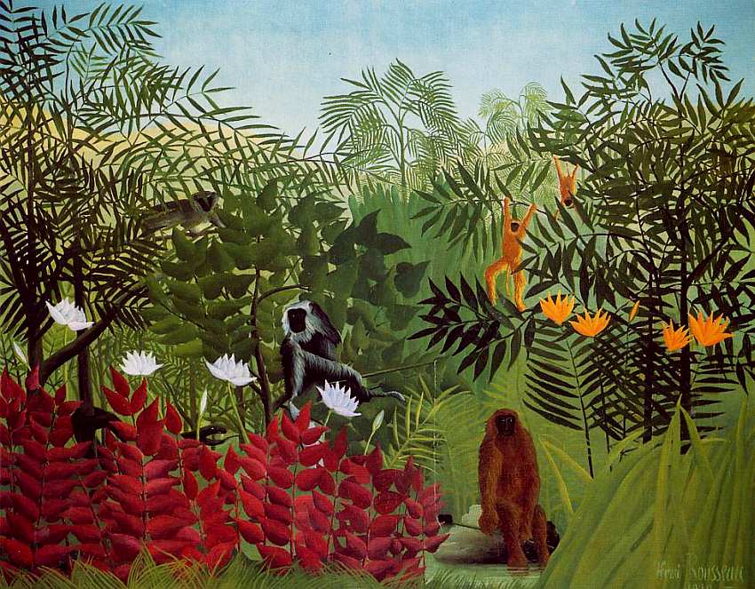 Написанная в год смерти автора картина «Тропический лес с обезьянами» показывает яркие, экзотические дебри тропиков. По зарослям скачут разноцветные обезьянки, красочные цветы и листья поражают своими размерами. Замечателен ритм повторяющихся листьев на первом плане — Руссо мог бы стать прекрасным декоратором. Все его картины несут позитивное начало, сам художник говорил: «Когда я просыпаюсь, я могу улыбнуться своим полотнам».
