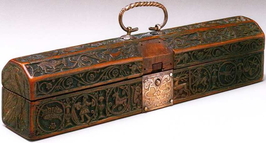Подобная форма и декоративные элементы напоминают о шкатулках, что дарили в Средневековье возлюбленным, со свадебными или новогодними подарками. Общины, братства и гильдии хранили в них официальные документы. Форма, размер и стиль позволяют отнести предмет к середине XVI столетия.