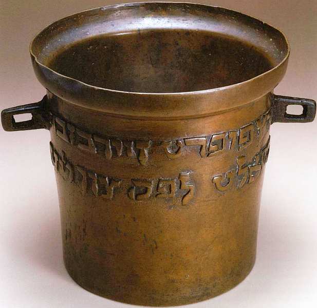 Интересно, что на данной кастрюле присутствует особая владельческая надпись. Возможно, она имеется потому, что хозяйки оставляли на общей плите еду, приготовленную заранее для субботних трапез (ведь в саму субботу варить запрещено). Текст гласит: «[Супруга] Гиртца Поперта, дочь Моше Лейтера, 5340 г.» (1579/1580). Слева от фамилии Лейтер помещено схематичное изображение лестницы («лейтер» — по-немецки «лестница»). Владелица кастрюли не названа по имени, она определена как жена и дочь. По всей видимости, ее отцом был человек, живший в доме с гербом в виде лестницы. Надписи на иврите довольно редко встречаются на бытовых предметах. Поскольку каждая буква в алфавите имеет также числовое значение, то при составлении текста имеется простор для игры словами и датами. Часто последняя зашифрована в стихе из Писания или какой-либо фразе, в которой значится фамилия владельца. Год, записанный на этом предмете, также может быть прочтен по-немецки как «лестница».