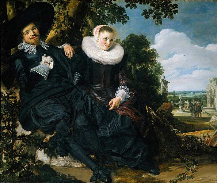 На этой картине художник запечатлел богатого торговца Изака Массу и его жену, дочь бургомистра, Беатрикс ван дер Лан. Портрет был заказан живописцу как свадебный, поэтому невеста с гордостью демонстрирует кольца — обручальное и надетое во время бракосочетания, а жених прижимает к груди руку: этот жест символизирует любовь и верность. Молодожены изображены в так называемом Саду любви, где виднеется статуя Юноны — древнеримской богини, покровительствовавшей браку, ходят ее птицы — павлины, и льется струя фонтана — символ плодовитости. Растения здесь тоже наделены смыслом: куст чертополоха, рядом с которым сидит Изак, означает мужскую преданность, плющ, здесь стелющийся по земле, — долг жены следовать за своим мужем, а виноградная лоза, обвивающая дерево, — вечную связь супругов.