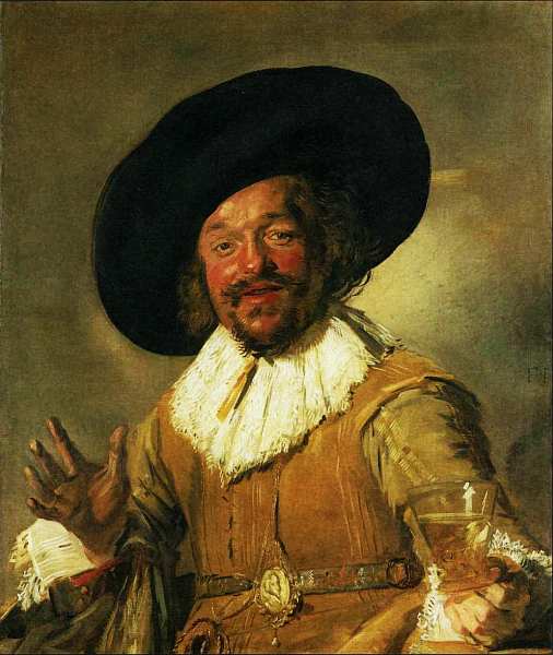 Халс первым стал рисовать портреты персонажей, находящихся в состоянии подпития и не только не стыдящихся этого, но приглашающих разделить их веселье. Таков и этот пьяница, разрумянившийся от обильного возлияния, с осоловелым, но счастливым взглядом протягивающий зрителю бокал с вином и что-то рассказывающий, неуверенно жестикулируя свободной рукой. Одет мужчина щеголевато, в костюм с тонкими кружевами, украшенный медальоном, шляпа заломлена набок. От его облика пышет жаром, и кажется, будто искры веселья рассыпаются вокруг.