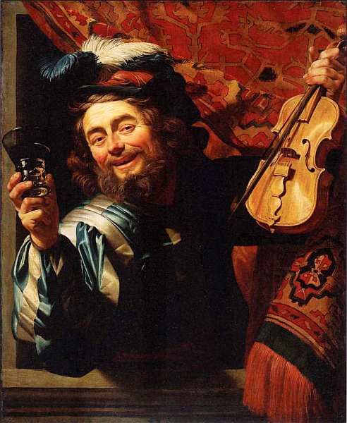 В данной работе светотень достаточно мягкая, но формы вылеплены именно светом. Живописец изобразил выглядывающего из окна музыканта, который в одной руке держит скрипку и смычок, а в другой — бокал с вином. В ранней живописи Караваджо нередко встречались музицирующие юноши, у него есть картина, где ангел играет на скрипке, но те персонажи созерцательно и отрешенно внимают звукам музыки. Голландскому же искусству была свойственна передача искренней радости, поэтому скрипач словно приглашает разделить его настроение. Впрочем, здесь представлен не человек сам по себе, а, скорее, аллегория веселья: во-первых, перед зрителем ряженый — герой одет в фантастический костюм, а во-вторых, основное в картине — душевное состояние музыканта.