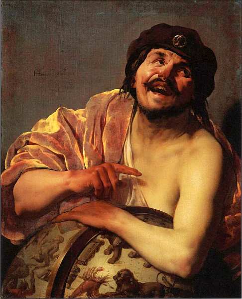 Еще античные авторы противопоставили философию Гераклита Эфесского и жившего немного позднее Демокрита Абдерского, назвав одного «мрачным», а другого — «смеющимся». Художники последующих времен не раз изображали их вместе. На одном из этих портретов сидит, опираясь на земной глобус и развернувшись в профиль, Гераклит. Его лицо погружено в тень, но на нем хорошо видно биение беспокойной мысли, которую старается донести до невидимого собеседника философ. Впрочем, движение его руки безвольно, а по щекам текут слезы: герой оплакивает глупость людей. Демокрит же, его вечный оппонент, представлен с небесным глобусом и обращен к зрителю лицом. Он откровенно смеется над человеческим невежеством, сопровождая это соответствующим жестом. Нос мужчины покраснел, видимо, от выпитого вина. Оба персонажа напоминают людей из простонародья благодаря сильным и грубоватым телам, откровенной мимике и жестам. Фигуры занимают все пространство полотен, и чувствуется, как от обоих изображенных исходит мощная жизненная энергия, сила мысли, выраженная по-разному — в слезах и смехе.