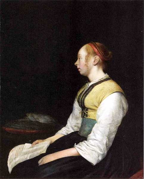 Живописец лейденской школы Герард Терборх создавал не столько сюжетную, сколько чувственную, материальную, утонченную живопись. На этой картине художник изобразил девушку в крестьянском костюме, с непокрытыми волосами, забранными ленточкой — так ходили незамужние селянки того времени. Но в руке она держит листы со стихами, которые нередко читали на костюмированных праздниках. Поэтому здесь представлена не крестьянка, а, скорее всего, сестра живописца Гезина, чей облик — стройная фигурка, круглящийся профиль со вздернутым носиком — можно видеть и на других его картинах.