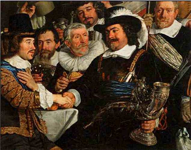 Мастер изобразил стрелков амстердамской гильдии Святого Георгия, празднующих подписание в 1848 Мюнстерского договора — одного из тех документов, в которых после восьмидесяти лет войны между Испанией и Нидерландами окончательно признавалась независимость последних. Офицеры собрались в «Старом зале» своей штаб-квартиры за длинным столом, они едят, пьют и поздравляют друг друга, как капитан Корнелис Витсен и лейтенант Йоханн ван Ваверен. Их имена известны потому, что за веревкой барабана на первом плане виден листок со стихами, где описан банкет. Капитан держит в руке серебряный рог, украшенный фигурой покровителя гильдии — святого Георгия, сидящего на коне и убивающего дракона, что в данном случае символизирует победу Голландии над завоевателями. К тому же «рог изобилия» является символом процветания, которого желали своей стране собравшиеся за праздничным столом.