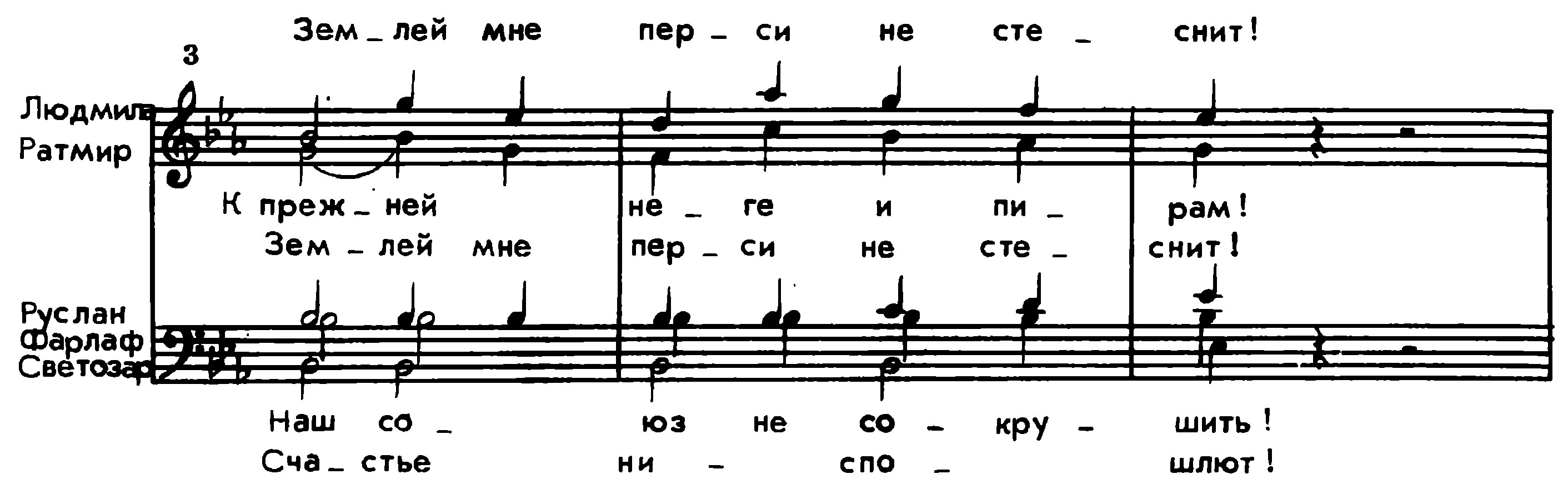 Можно взять для примера финал первого акта «Руслана», в котором немало весьма медленных темпов. Извлекая волшебные звукосочетания с самых больших глубин этой «бездонной» партитуры, Вячеслав Иванович вел финал со все возрастающим напряжением. И здесь он был верен своему принципу — накапливать энергию для кульминации. В каноне «Какое чудное мгновение…» воцарялась ровная звучность, все замирало, все погружалось в состояние оцепенения… Еле слышен хор. «Но тихо все…», и над ним как бы парящая в вышине флейта. Но вот вспышка: «Где Людмила? Где юная княжна?…» И пружина, вобравшая в себя всю энергию, начинает раскручиваться, приобретая все бо?льшую и бо?льшую стремительность. А от вступления Ратмира «О витязи…» на сцене у всех загораются глаза, не осталось и следа ни от свадебной торжественности, ни от оцепенения после похищения Людмилы. Все полны энергии, все жаждут отомстить, разыскать злодея.