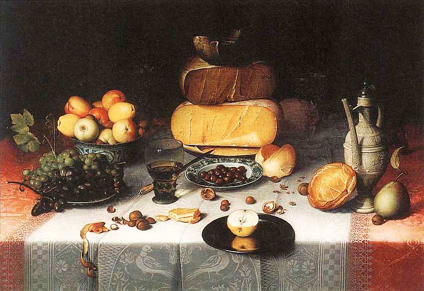Все это видно и в данной работе. Поверх восточного ковра наброшена камчатная скатерть с вытканным рисунком, а на ней стоят ваза с яблоками и грушами, фарфоровая тарелка с виноградом, керамический кувшин, бокал с вином, лежат орехи. В центре композиции громоздятся горкой сыры.