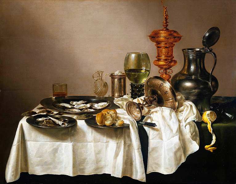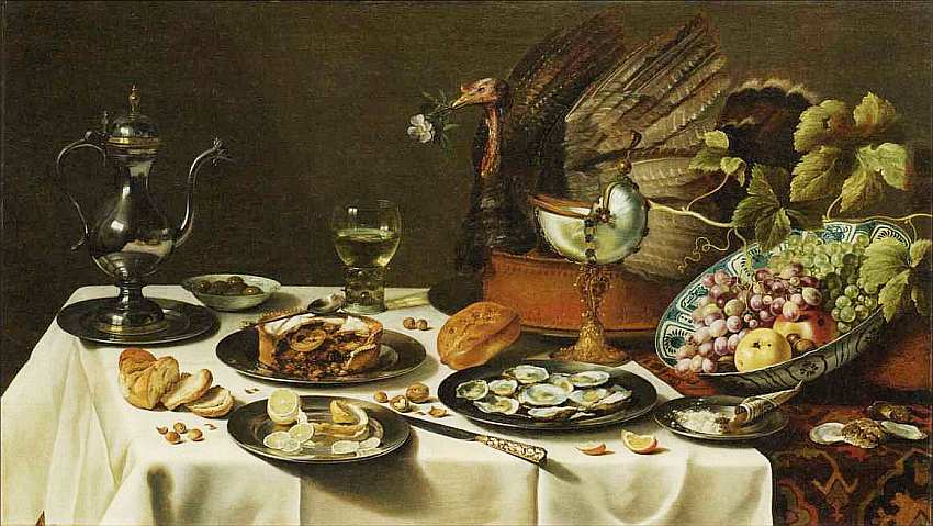 «Завтраки» харлемского мастера Питера Класа предназначались, как все подобные натюрморты, для интерьеров богатых домов и поэтому отображали соответствующий быт. На этой картине художник представил изысканно сервированный стол с дорогой камчатной скатертью, серебряной и фарфоровой посудой, кубком из раковины наутилуса, устрицами, виноградом, оливками и пирогом, украшенным неощипанной индейкой. Здесь можно видеть и изящный оловянный кувшин, и рюмку с вином, и ягодный пирог, и лимон, и кулек с пряностями. Тот, кому предназначался этот завтрак, уже отведал кушаний, оставив следы живописного беспорядка.