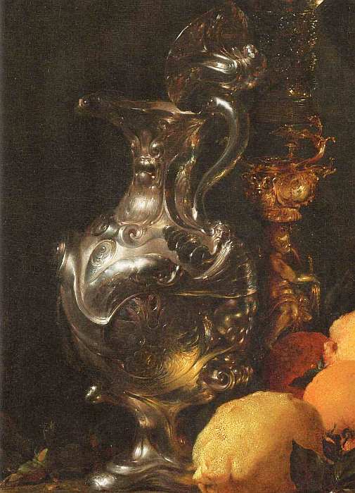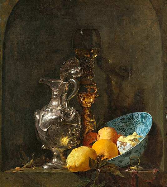 В данном случае художник изобразил серебряный кувшин, бокал с вином на позолоченной подставке, глубокую фарфоровую тарелку с фруктами. Игра света и цвета — вот что интересовало его, использовавшего сочетание желтого, белого и синего. У Калфа лимон отражается в начищенном боку кувшина, серебро блестит рядом с тускло сияющей позолотой, мякоть лимона сверкает каплями сока, в полутьме мерцает вино в бокале. Все будто живое, фрукты словно источают запах и даже вызывают ощущение их вкуса, но вытянутая по вертикали форма полотна, а также изображение всей постановки, увиденной немного снизу, придают «вес» предметам, возвеличивают их.