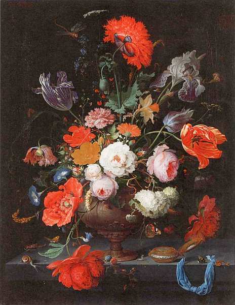 На представленной картине изображены живописно стоящие в вазе цветы: пионы, маки, гвоздики, ирисы, тюльпаны, нарцисс. Большинство из них полностью раскрылось и пребывает в восхитительном состоянии равновесия, являя миру свою полуденную красоту. Нежные вьюнки обвивают сильные стебли, колосья щетинят усики. Здесь же ползают и летают осы и мухи, сидит большая бабочка и любопытная улитка свесила рожки, словно желая рассмотреть со всех сторон большой красный цветок. Но в стороне от этого великолепия лежат карманные часы с голубой лентой, напоминающие о течении времени, и сами срезанные цветы, которые, увы, недолговечны, намекают на то, что все проходит.